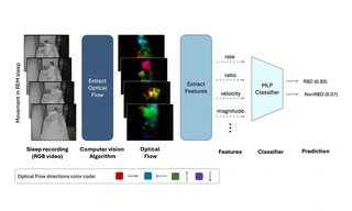 The dataset included 172 vPSG recordings from a clinical sleep center, 81 patients with iRBD and 91 non-RBD healthy controls (63 with a range of other sleep disorders and 28 healthy sleepers). An optical flow computer vision algorithm automatically detected movements during rapid eye movement (REM) sleep, from which features of rate, ratio, magnitude and velocity of movements, and ratio of immobility were extracted.